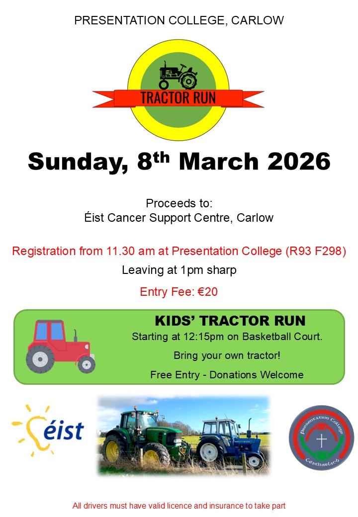 Our annual Tractor Run will take place on Sunday 8th March. There will be a raffle on the day for FANTASTIC PRIZES!! Tickets for the raffle will be on sale all during the week at lunch time in the canteen. They cost €2 a strip or three strips for €5. Cash or card (not on phone!) will be accepted. Your support will be greatly appreciated. A huge thanks also to our many sponsors.