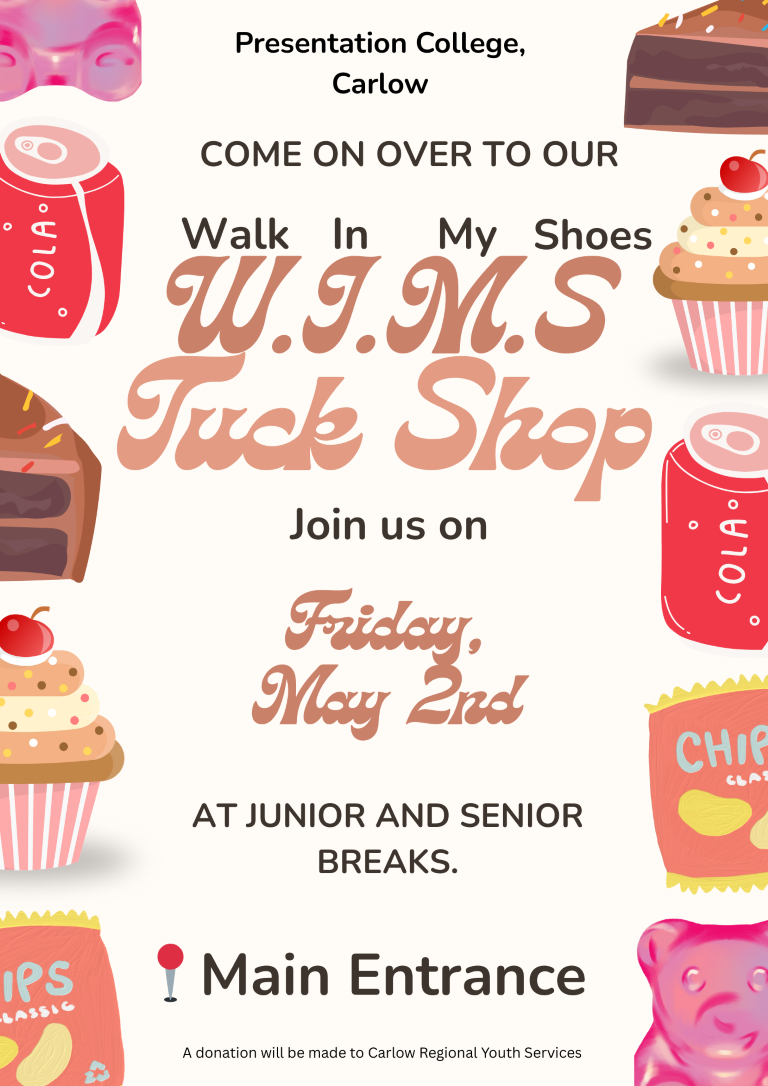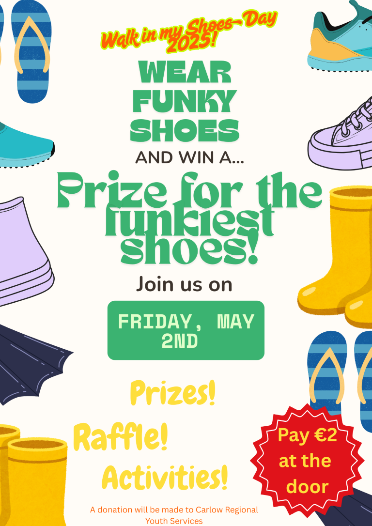 There will be a prize for the funkiest shoes on the day.  There will also be a raffle, tuck shop and fun activities organised by Student Council.  A donation from proceeds raised will be made to Carlow Regional Youth Services who provide a wellbeing, counselling and support service for young people in Carlow.