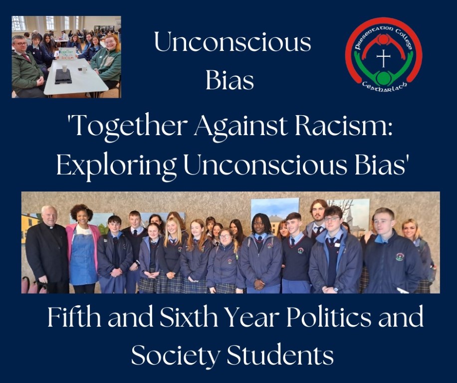 Fifth and Sixth Year Politics and Society students with teachers Ms. O’ Doherty and Mr. Carley participated last week in a very interactive conversation around Unconscious Bias, titled “Together Against Racism: Exploring Unconscious Bias” with a key address by Emer O’Neill. This event organised by Carlow College was held in the Visual, Carlow. Click on the heading for more..