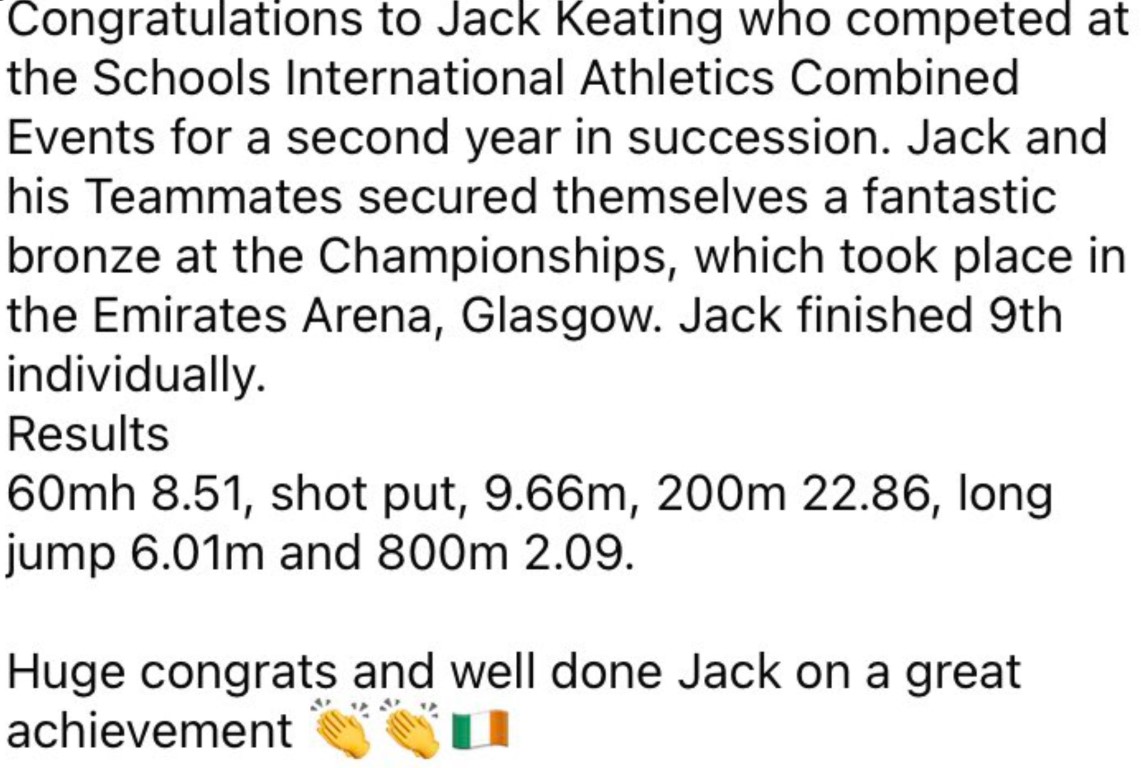 Congratulations to Jack Mahon who finished eighth in the All Ireland under 17 at the National Cross Country Championships in Tramore.