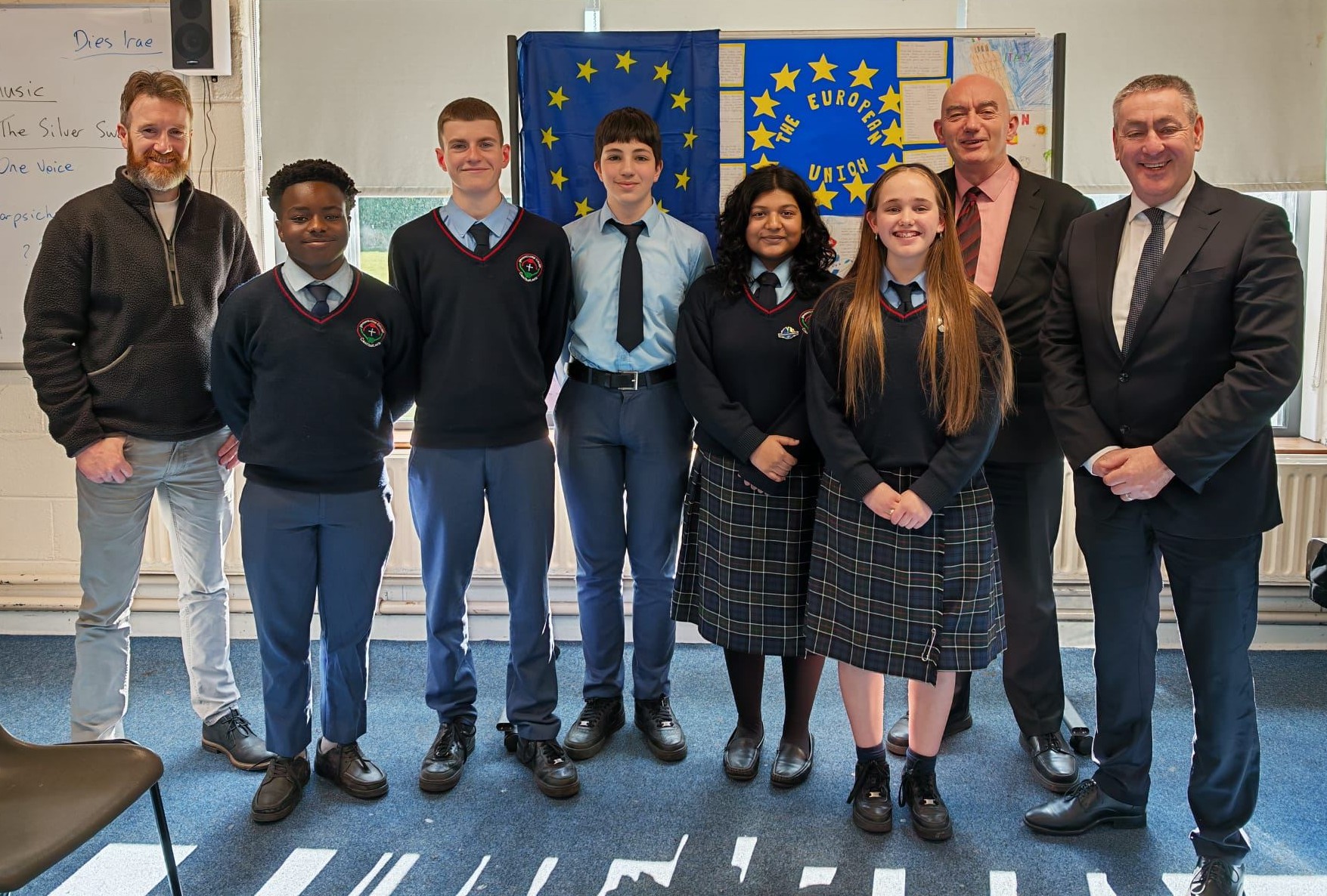 On Friday the sixth of March our Second Year CSPE students and some of our senior Politics and Society students gathered in the library to learn about the life and work of an MEP. Billy Keppeher MEP answered questions and kept the students engaged in an informative morning. Many thanks to Mr O'Mahoney for organising. Thanks also to Mr McDermott for many of the photos. Ms Byrne's 2AS CSPE class had made posters which were on display and the EU flag as well as the Irish flag were flying at the entrance of the school to mark the occasion.