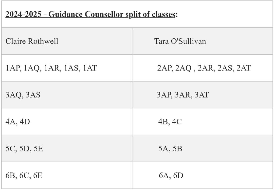 Both Guidance Counsellors are also members of the Pastoral Care Team and as such meet students in class and individually.